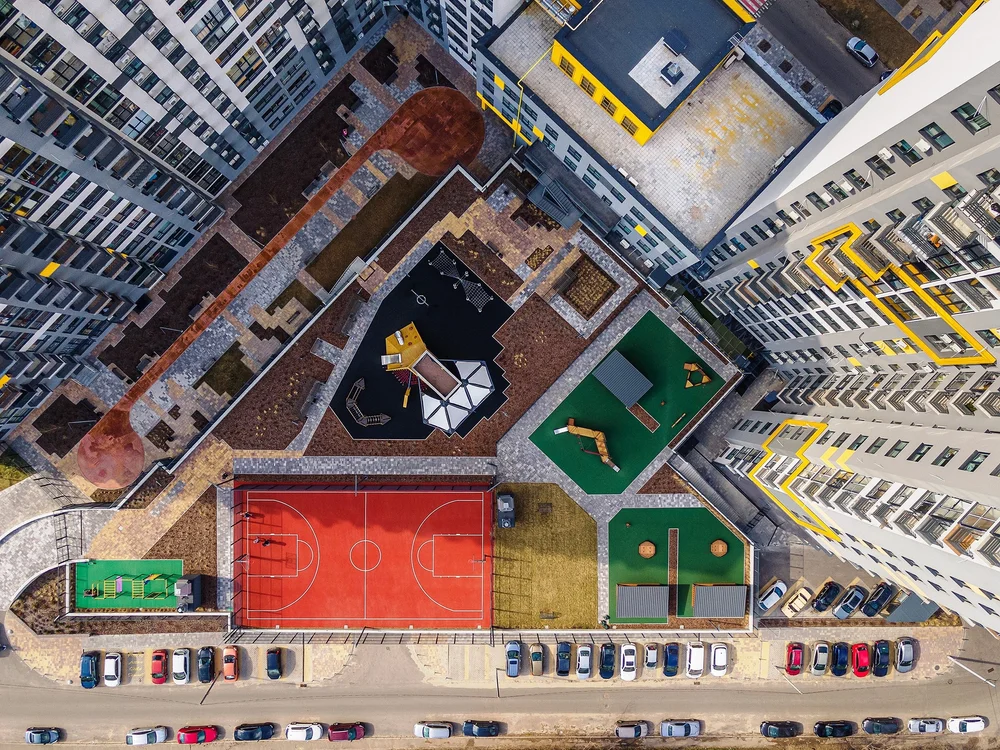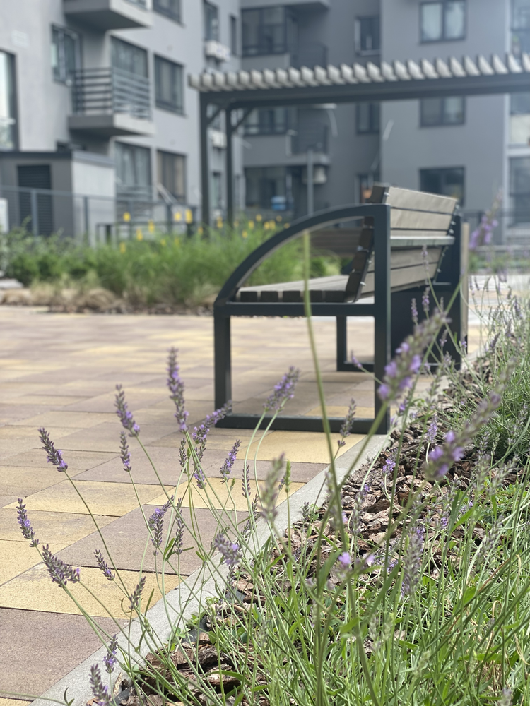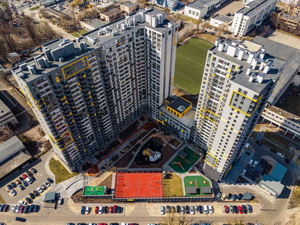 Як результат отримали високотехнологічне приміщення паркінгу, абсолютно «сухе» навіть після сильних дощових підтоплень всього Києва та комфортний внутрішній простір житлового комплексу з різноманітним озелененням.